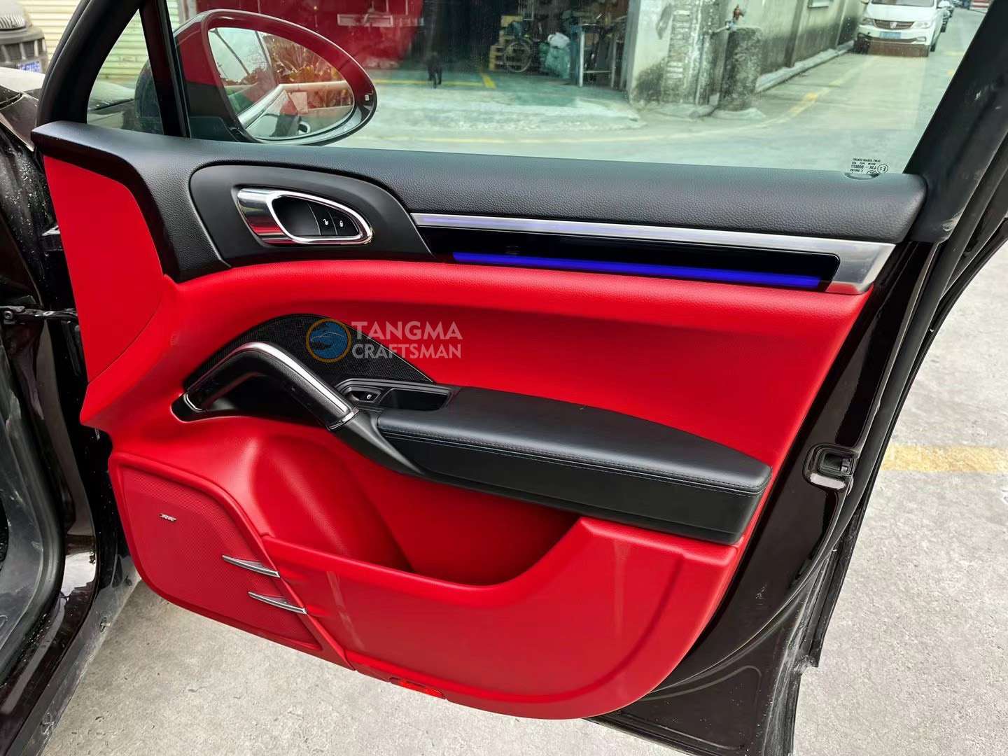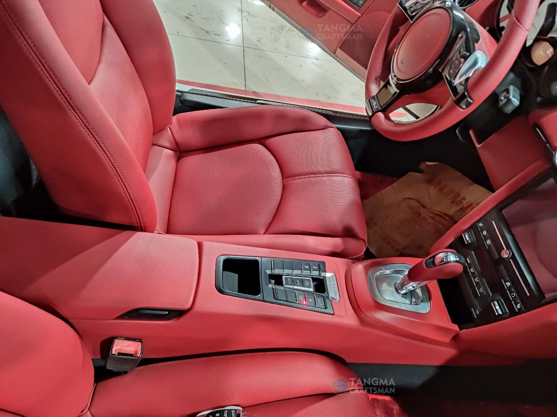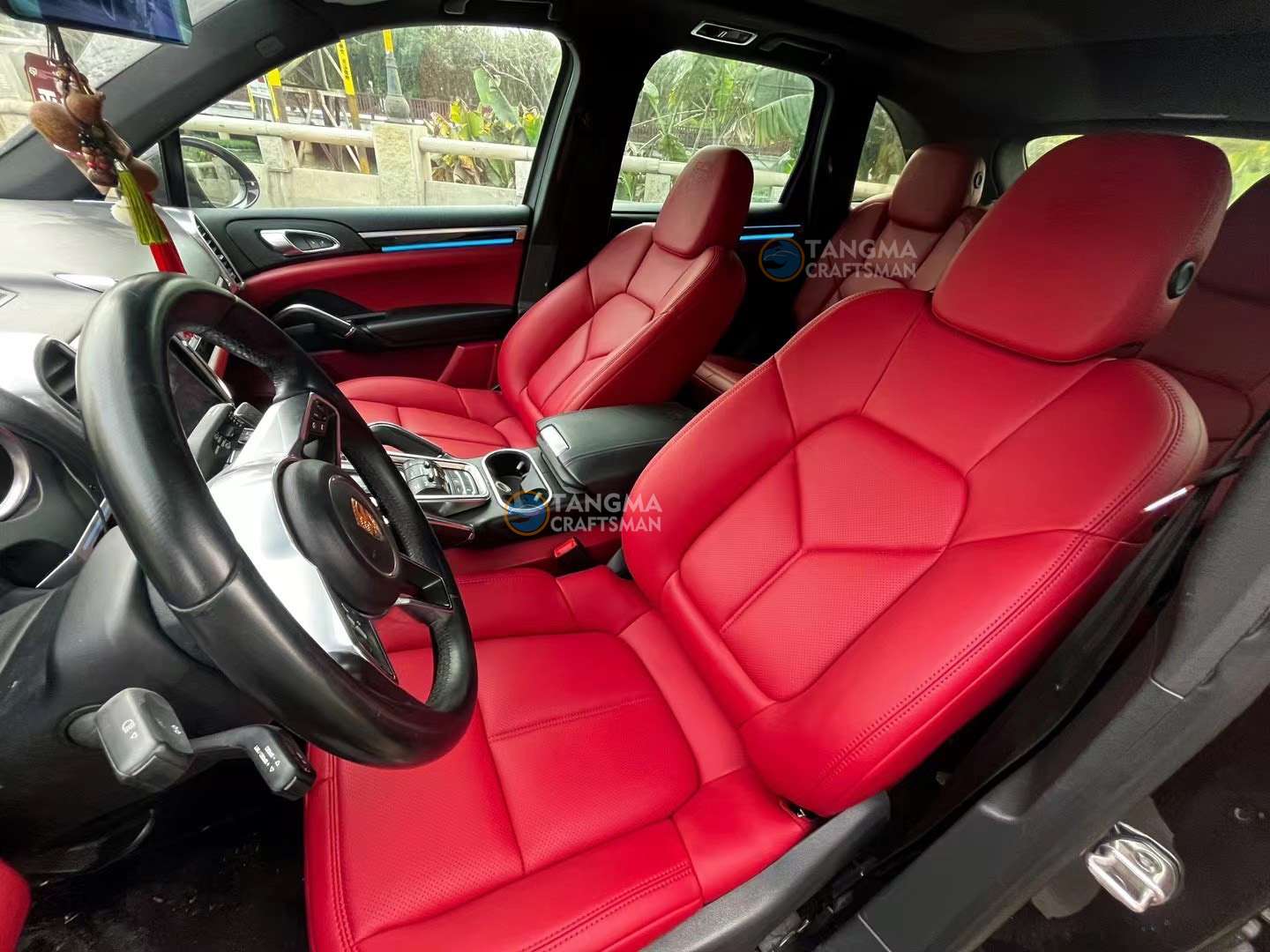 Porsche interior seat Bordeaux red cowhide upgrade: Premium first layer leather replica soft interior kit for luxury automotive styling and comfort.